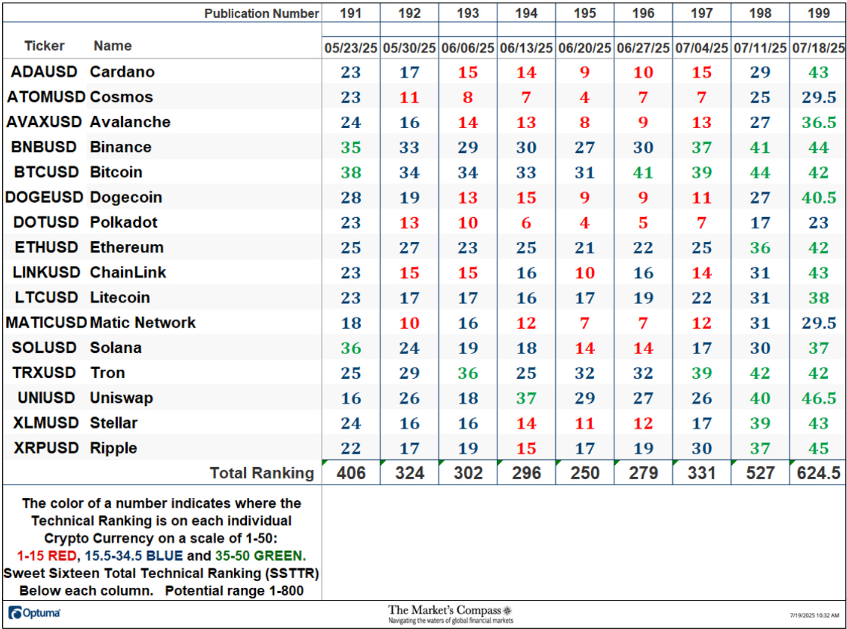 Welcome to this week’s publication of the Market’s Compass Crypto Sweet Sixteen Study #199. The Study tracks the technical condition of sixteen of the larger market cap cryptocurrencies. Every week the Studies will highlight the technical changes of the 16 cryptocurrencies that I track as well as highlights on noteworthy moves in individual Cryptocurren…